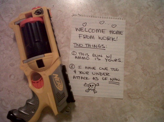 The boys & I were hid throughout the house with our Nerf guns locked & loaded when Ronnie came home from work. What a blast! I need to remember more often that making memories is worth the mess.